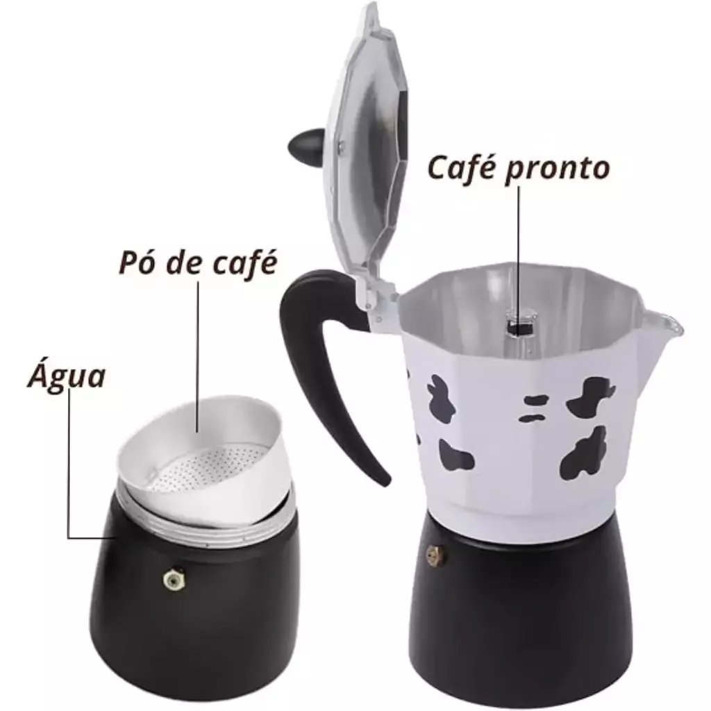 Um toque divertido para os amantes de café passado na hora. Com estampa estilo vaquinha em branco e preto, essa cafeteira italiana une charme, praticidade e aquele aroma irresistível de café fresco.