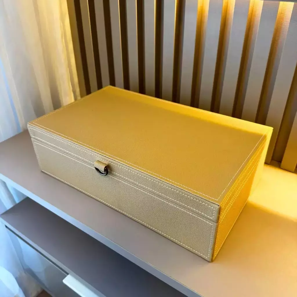 Com design imponente e acabamento em couro sintético bege, essa caixa decorativa une presença e delicadeza em um só item. A costura branca aparente e o puxador em metal trazem charme sutil aos detalhes, enquanto o tom neutro combina facilmente com qualquer estilo de decoração.