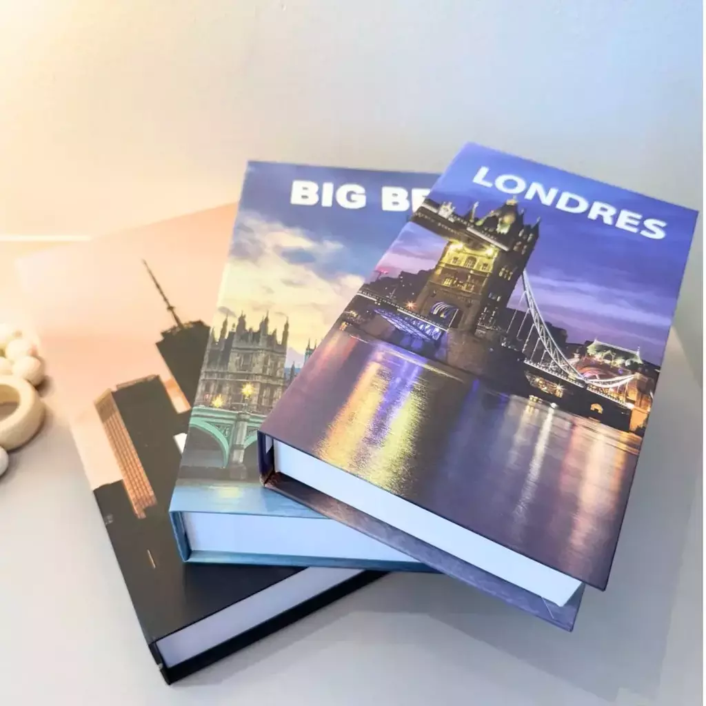Com um visual que inspira viagens e lembranças, esse conjunto de caixas em formato de livro traz imagens icônicas de Londres e Nova York para compor a decoração com personalidade.
