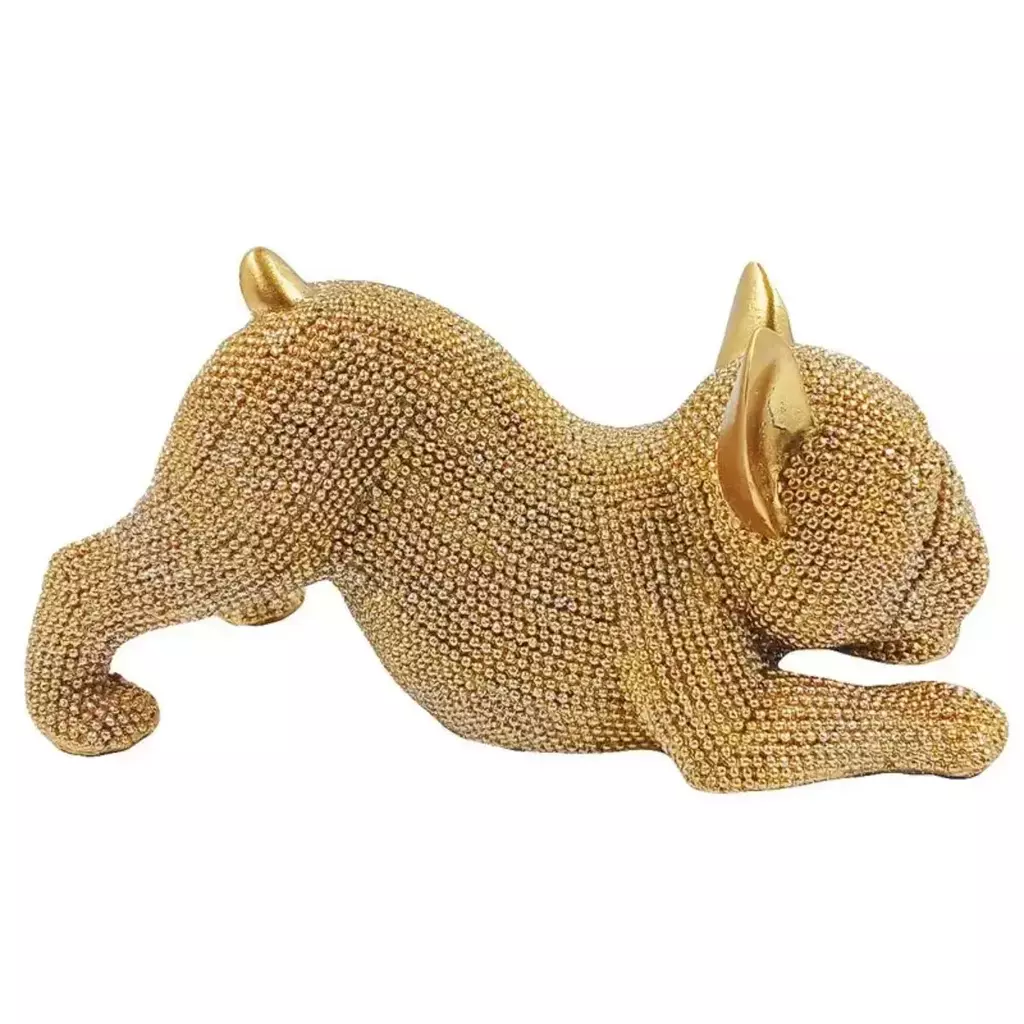 É feito de resina, com acabamento dourado, imitando a posição comumente feita por um bulldog francês. Beleza e graça que encantam e deixam qualquer decoração ainda mais bonita.